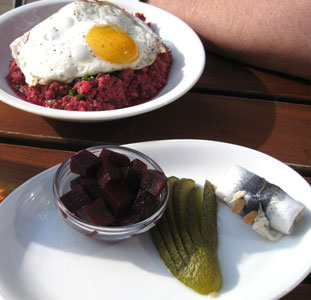 Labskaus wird niemals die Chance haben, ein Topmodel unter den Tellergerichten werden, das gilt auch für die Variante in der Oberhafenkantine. Es kommt dunkelrot daher, nicht zu suppig, sondern noch ein wenig stückig. Fisch ist bereits enthalten und verleiht dem Brei eine etwas zu dominierende Säure. Dazu gibt es ein Spiegelei, einen Rollmops, etwas Gurke und Rote Bete. Gute Qualität, mit 13,- Euro allerdings kein Schnäppchen.