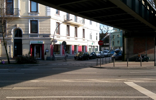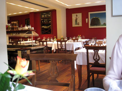 Ein Billig-Italiener ist er nicht, der Paolino. Und auch der Umzug vom alten Alsterstandort mit seinem kolossalem Ausblick an den neuen Platz mit regelmäßigem U-Bahn-Gerumpel im Ohr und Hauptverkehrsstraße vor dem Auge hat die Preise nicht gedrückt. Dafür sitzt man in einem gepflegt eingerichteten Restaurant und bekommt - mittags sogar ohne lange Wartezeiten - italienische Speisen gehobener Qualität serviert. Der Preis für den offenen roten Hauswein liegt mit 4,50 Euro im Normalbereich, der für die kleine Pellegrino mit 2,- Euro ebenso. Seltsame Kunstwerke hängen an den Wänden, eines der Gemälde zeigt einen Vogel, der einen Menschenkopf vollkackt. Vermutlich ist das irgendwie symbolisch gemeint. Es gibt aber auch Fotos von Stars, die früher das alte 'Paolino' an der Alster besucht haben.