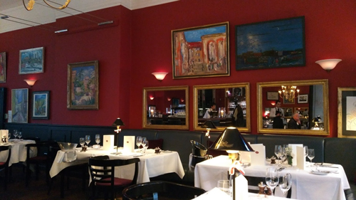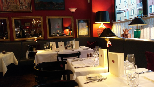 Brasserie versetzt, die dunkelrot gehaltenen Wände werden von