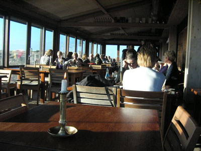 halbwegs bequem an dunklen Holztischen und kann abends mit Blick auf die