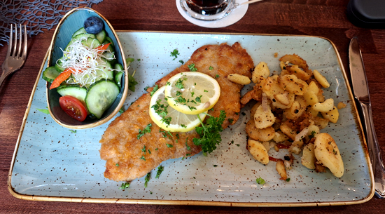 Ein üppiges 'Schnitzel "Wiener Art" an frischem Champignonrahm und Kartoffelröstinchen' für knapp 15 Euro überzeugte nicht nur durch bemerkenswerte Zartheit, sondern auch durch erstaunliche Aromenfülle und Fettarmut der krossen Panade, Hut ab! Der feinen, leicht bitteren Salatbeilage hatte man die Bitterkeit glücklicherweise NICHT mit dem leider allgegenwärtigen Balsamico ausgetrieben, gut so. Die Bratkartoffeln dazu waren wunderbar unfettig und knusprig, bestachen durch ausgesuchte Kartoffelqualität.