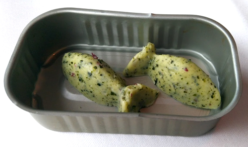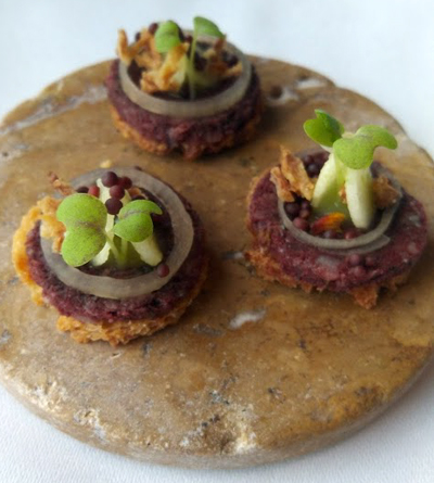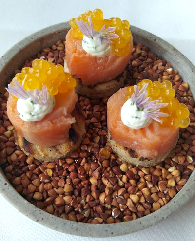Das Menü begann mit filigranen Küchengrüßen, Lachs und Blutwurst: