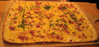 Der Flammkuchen überzeugte durch hauchdünnen Teig und eine gelungene Abstimmung der Auflagen (Speck, Käse, Zwiebeln), mit 7,90 Euro nicht zu teuer. Die grob gehackten Zwiebeln hätten eine Spur feiner geschnitten sein können, wer beißt schon gern in Zwiebelbrocken?