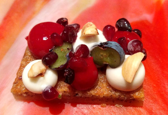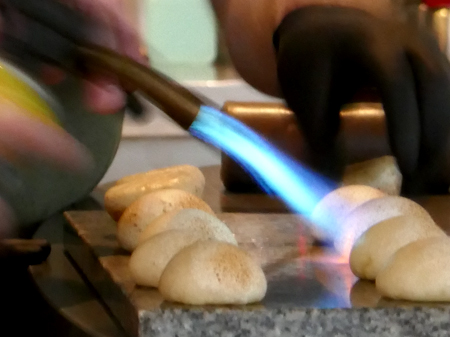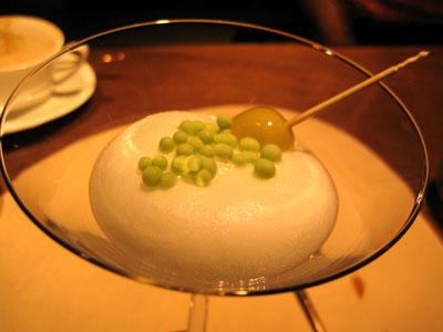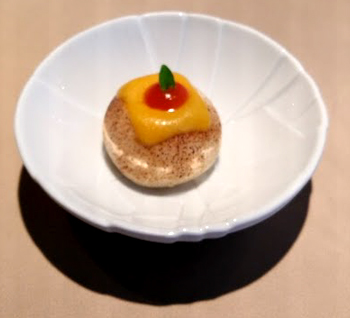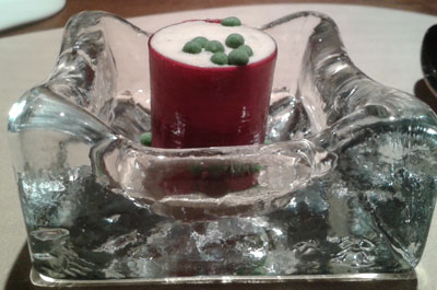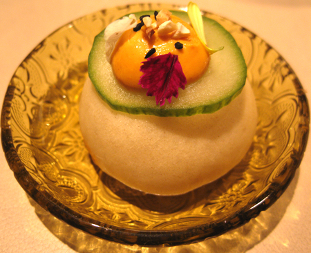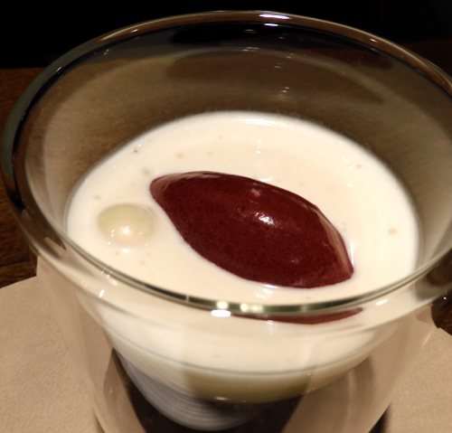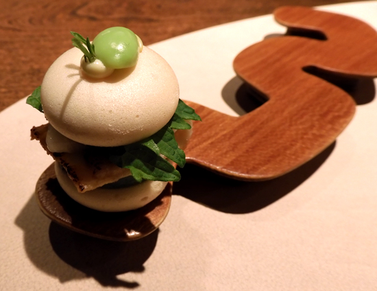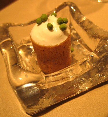 Wie schon vor einem halben Jahr gab es Carabinero, dieses Mal als "Carabinero mit Tom Kha Gai Eis grüne Mango, Sushireis, Philadelphia & Kimchi". Die Japanerin am Tisch fiel ob der grandiosen Qualität des Reises fast in Ohnmacht, wir fanden eher den ungewohnten Hühnersuppengeschmack im Eis grandios. Es wurde allen Ernstes mit einem knusprigen Stück Hühnerhaut serviert: