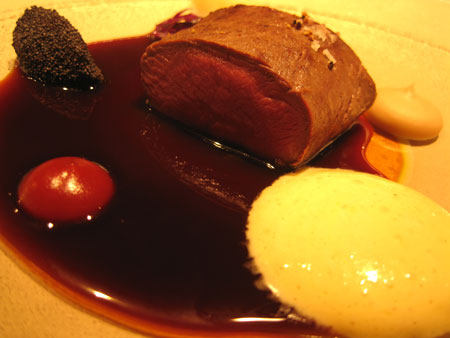 Der Hauptgang "Rehrücken mit Rote Bete, Pfirsich-Melba, Sherryessig-Hollandaise & Pfefferjus" war geeignet, uns zum niederknien zu bewegen - wir kamen nur so schlecht aus den Sesseln. Wunderbar zartes Fleisch, Rote Bete extrem frisch und fern ihrer gefürchteten Muffigkeit in einer kleinen Rolle (oben im Bild):