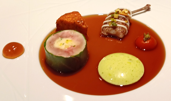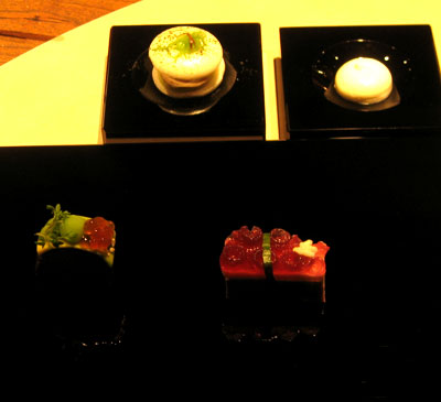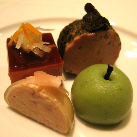 Magic Table mit Foie Gras, Sardinen-Gel, Ziegencreme & Mojoeis