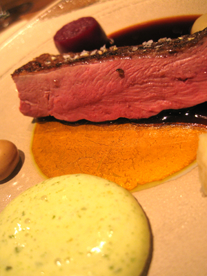 Challans Entenbrust mit Kürbis, Shiso, Erdnuss, Passionsfrucht-Hollandaise & Curryjus