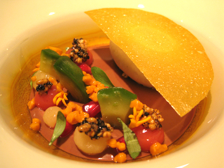 Auf den ersten Blick liest sich das Menü wie das vom Vorjahr, nur eben um 10 Euro teurer - unter der Haube hat sich jedoch, abgesehen von der Gänseleber, sehr viel getan. Nach wie vor agiert man im "The Table" näher an den Experimenten des Ferran Adrià als an der klassischen französischen Küche. Freunde von Brotkorb, Sahne und Butter kommen also nicht auf ihre Kosten, Kohlenhydrate sind Fehlanzeige. Und Ferran Adrià ging es eben nicht allein um seine viel gerühmte Molekularküche, sondern um die Einführung von günstigen Allerweltsnahrungsmitteln in die Hochküche. Fehling legt sich nun ebenfalls nicht nur auf Luxusprodukte fest, sondern bietet durchaus Gurkensalat und Kabeljau - letzteren allerdings von exorbitant hoher Qualität und in allerfeinster Zubereitungsform:
