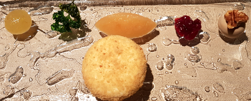 Petit Four Inspiration Puzzle Bar --- Das feste Menü (275,- € pro Person) wurde auch Ende Oktober 2023 mit nur wenigen Änderungen wie schon im Mai serviert - allerdings hatten die Getränkepreise angezogen. Der 2018er Chablis kostete statt 80,- € nun 96,- €. Und zum ersten Mal seit Jahren war Kevin Fehling im wie üblich ausgebuchten 'The Table' nicht anwesend. Dem Menü und dem Service tat das allerdings keinen Abbruch, alles lief wie ein Uhrwerk, wie eine perfekte Choreographie, und wir genossen einen sehr gelungenen Abend. Ein paar Eindrücke: