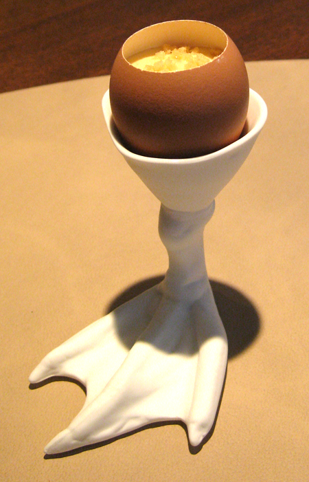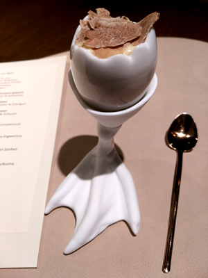 Ein bei 64 °C Grad eine Stunde lang erhitztes Trüffelei mit Kalbsgraupen, Pilzen & Dashi, eine unglaublich duftende und aromatische Köstlichkeit: