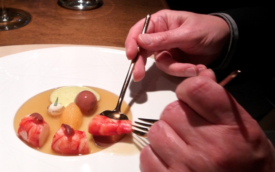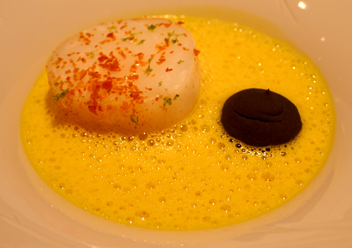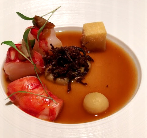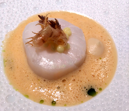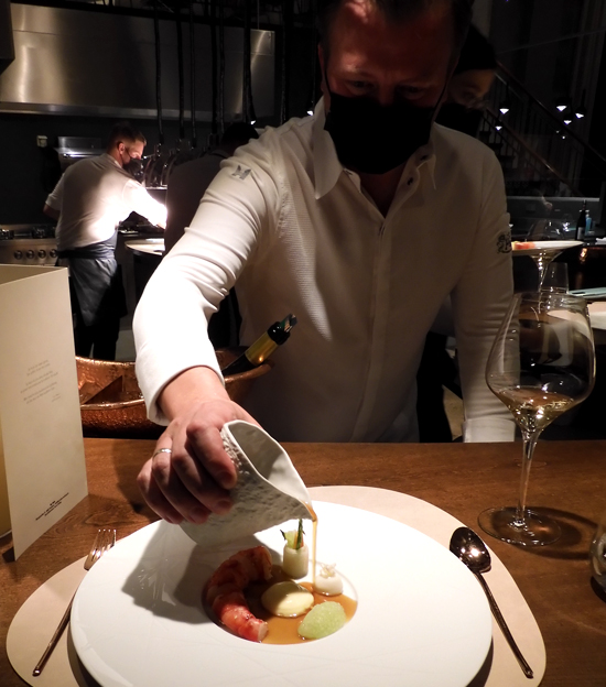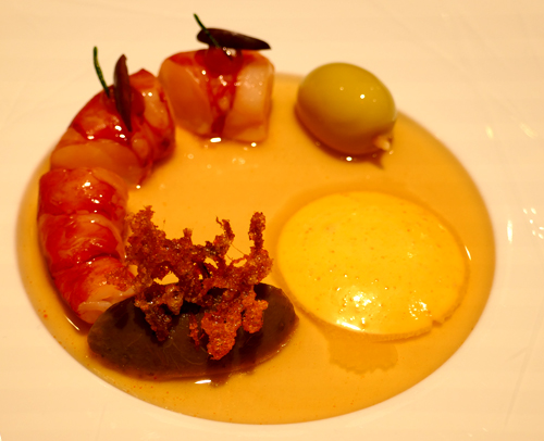 Carabinero mit Aubergine, Panis, Tandooricreme & Rinderschmorfond - wobei der Fond von Herrn Fehling persönlich kredenzt wurde: