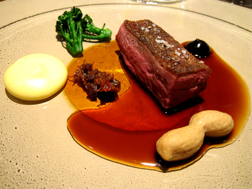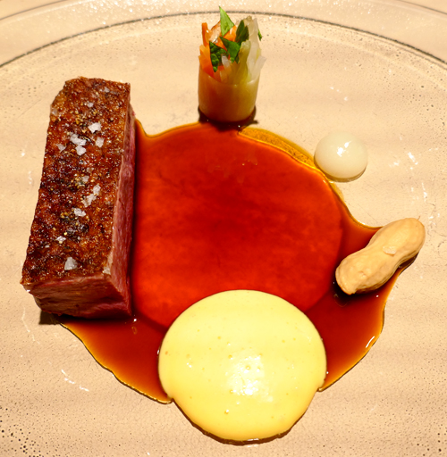 Jack‘s Creek Wagyu Roastbeef geschmorter Schaufelbraten, Kürbis, Erdnuss & Shisojus
