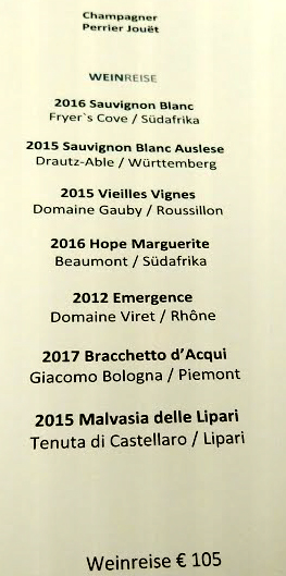Im September 2017 war alles beim Alten - vom Preis abgesehen, der sich leicht auf 205,- € je Menü/Person erhöht hat. Die Getränkepreise finden sich nach wie vor am oberen Ende. Leider stellten wir erst zu hause fest, dass 2 Gläser 'Perrier Jouet Grand brut' Champagner mit 36,- berechnet worden waren, wiewohl wir nur trockenen Sherry bekommen hatten. Dafür war der 2013er Syrah Mullineux aus Südafrika sehr stimmig und mit 80,- Euro angemessen ausgepreist.