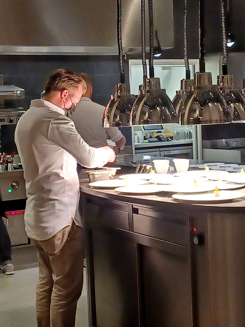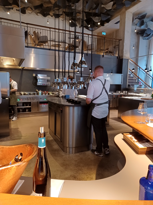 Wiewohl die Barhocker auf den ersten Blick etwas unbequem wirken mögen, hält man es doch ohne Probleme die knapp vier Stunden, die das 7-Gänge-Menü - es gibt nur dieses eine! - dann dauert, gut aus. Es handelt sich mehr um hohe Sessel denn wirklich um Hocker. Der Blick in die offene Küche ist spannend, die präzise, gleichmäßige und hochkonzentrierte Arbeit der Köche vermittelt keine Hektik, sondern erweckt den vollkommen gegenteiligen Eindruck: Entspannte Ruhe.