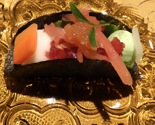 Tatar, Toro & Dashi vom Blauflossenthunfisch mit Avocado, Seeigelcreme und Alge
