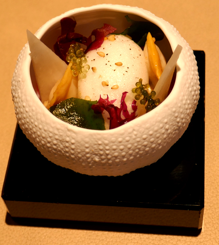 Der nächste Gang, ebenfalls ein Klassiker hier: Carabinero. Ein Teller zum niederknien. Allerfeinste, saftige Produktqualität, auf den Punkt (wohl sous vide) gegart, das Ganze in einem unfassbar umamilastigen Ponzu-Dashi ruhend. Wir konnten bislang mit Dashi wenig bis nichts anfangen, aber so etwas Köstliches hatten wir auch noch nie bekommen: