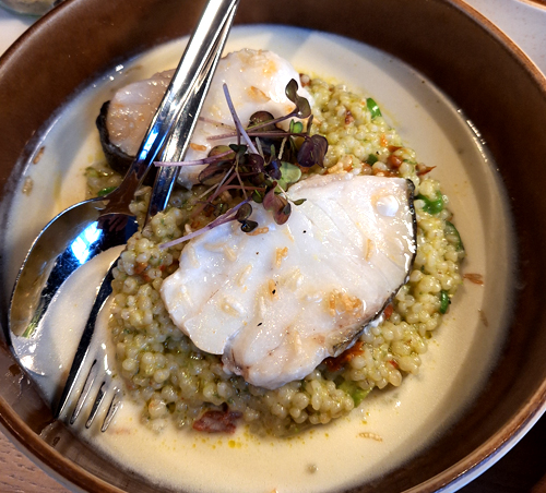 Die Vorspeise kam mit 'Sommersalat' liebevoll angerichtet daher und erwies sich als munterer Opener: Es gab zarten Beizlachs geflämmt, auf geeister, aber ansonsten langweiliger Limonen-Olivencreme. Zudem köstlichen Burrata auf Vierländer Tomaten sowie eine nette Tatarstulle mit gebackener Kapernapfel und confiertes Eigelb. Allerdings unterscheidet sich ein gebackener Kapernapfel kaum von eingelegtem.