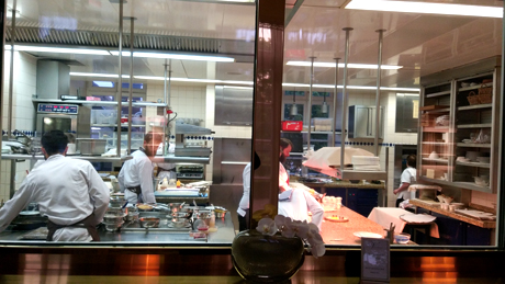großräumigen Fenstern der Küche. Von dort winkten uns aufgeräumte Köche