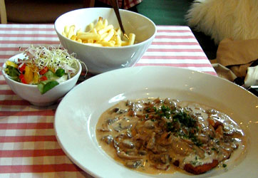 Putzigerweise findet sich das Tischdeckenmuster auf der Bekleidung der aufmerksamen Bedienung wieder, kleinkariert auf den Herrenhemden, große Karos auf den Blusen der Damen. Die Stimmung ist aufgeräumt-kumpelhaft, es kann durchaus geschehen, dass sich Meister Wollenberg mit beiden Händen auf die Schultern des Gastes stützt und 'Alles gut?' ruft - natürlich kennt er die Antwort. Die gehobene Qualität der Hausmannskost im 'Wattkorn' erlaubt es sogar, ein absolutes No-Go zu ordern: Jägerschnitzel. Wunderbar zart und aromatisch, mit frischen Pfifferlingen und Champignons in einer nicht zu schweren Sauce. Dazu hätten vielleicht Nudeln besser gepasst als die kleinen Pommes Frites (weiß der Henker, warum die hier 'krosse Kartoffelstäbchen' genannt werden), dafür mundete der bunte und knackige Salat im Schüsselchen ausgezeichnet - für 8,50 Euro (Mittagstisch) kann sicher nicht mehr erwartet werden:
