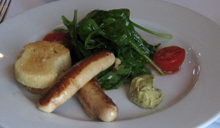 Eine höchst originelle Vorspeise findet sich auch auf der Karte, nämlich eine Bratwurst aus Krabben und Zander. Serviert wurden zwei davon. Sie sahen aus wie eine gewöhnliche feine Bratwürste aus Schweinefleisch, nur etwas kleiner, und irgendwie erwartete man beim ersten Biss auch den entsprechenden Geschmack. Der blieb aus, was eine Millisekunde für Enttäuschung sorgte, um dann großer Freude über die wirklich extrem gut gelungene Abmischung Platz zu machen. Mildes Krabbenaroma überwog, hervorragend ergänzt durch den noch eine Spur milderen Estragonsenf. Dazu gab es Brioche und knackfrische Blätter vom Feldsalat. Ein kleiner, ganz großer Teller, für den die verlangten 9,60 Euro nicht weh tun.