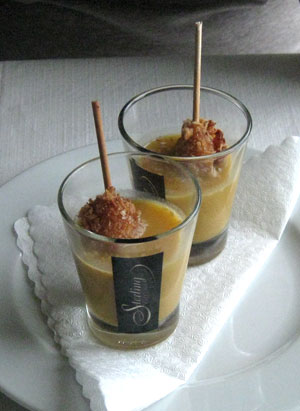 Im Juni 2014 fanden wir uns erneut ein im 'Weltenbummer'. Das Restaurant war an diesem Sonntag schwach besucht, und wir wurden ausgesprochen freundlich bedient, mit strahlendem Lächeln. Nach dem Gruß aus der Küche - wunderbar knusprig frittierte Scampi in pikanter Tapioka-Suppe - strahlten dann auch wir.