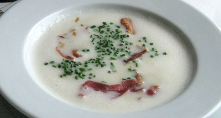 Die gute Laune sollte weiter anhalten, denn auch die Vorspeisen waren wirklich sehr fein. Das galt für die erfreulich leichte Spargelsuppe, die ohne Sahne und Spargelstücke, dafür aber mit krossem Pancetta, daherkam, ebenso wie für den Topinambur-Salat: Topinambur hauchfein gehobelt und sanft mariniert, dazu gebackener und karamellisierter Ziegenfrischkäse und ein wenig knackiges Grünzeug.