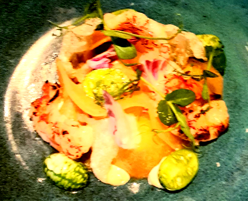 I geflämmte Rotgarnele mit Charantais-Melone, Radicchio, Chips