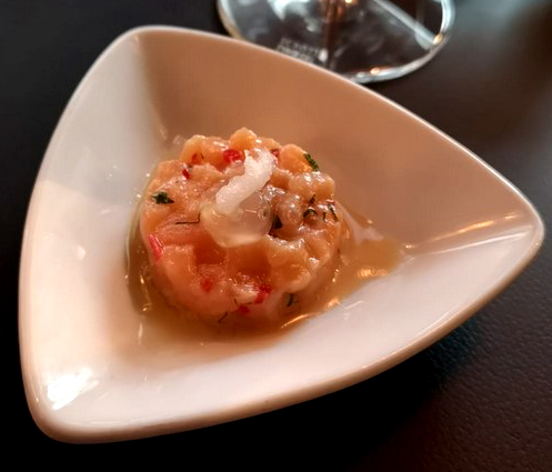 mit dem Wasser und einem Lachs-Ceviche, das sich überraschend ausgewogen