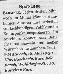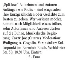 Für einige Ausgaben der Spät-Lese existieren Tonaufzeichnungen. Zum Anhören der Texte einfach aufs jeweilige Lautsprechersymbol klicken (mp3)! Falls kein Player auf Ihrem Computer vorhanden ist, bitte einfach den kostenlosen Winamp herunterladen (Version 2.64) und installieren. |